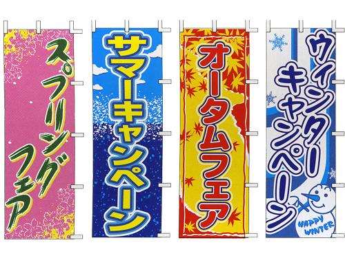 綿製品の幕類から紙出力のもの、アルミ複合板などで作った耐久性・耐光性のよいものまでいろいろとバリエーションがあります。用途にあわせて適したものをご提案させていただきます。
