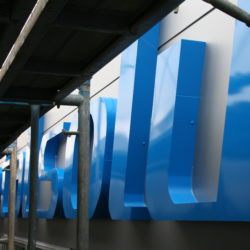 箱文字にサインシートを貼って文字取付けをしている所です。
