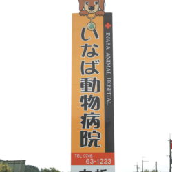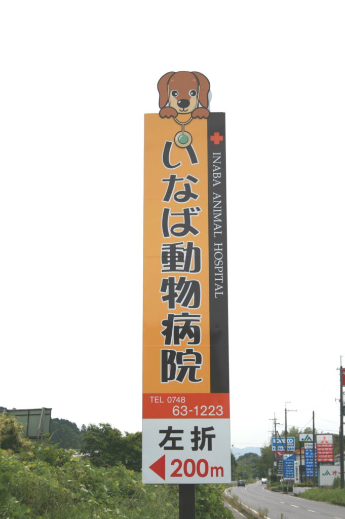 誘導の看板です。 大切な家族の健康チェックはいなば動物病院までお願いします この看板を曲がって200M右側です。水口町新城