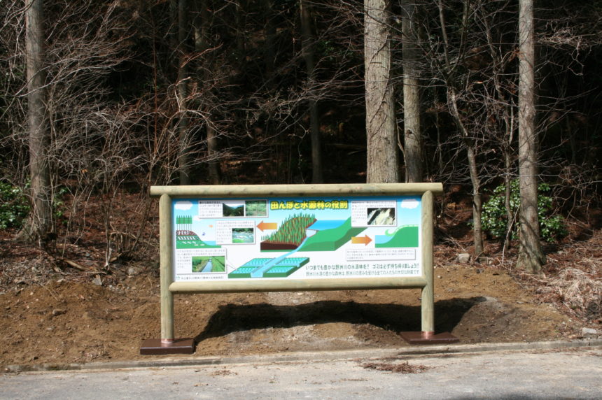 田んぼと水資源の役割の看板です。 野洲川ダムに行くと幼少期の自然を感じます。 山間と川の水はほんとすばらしい